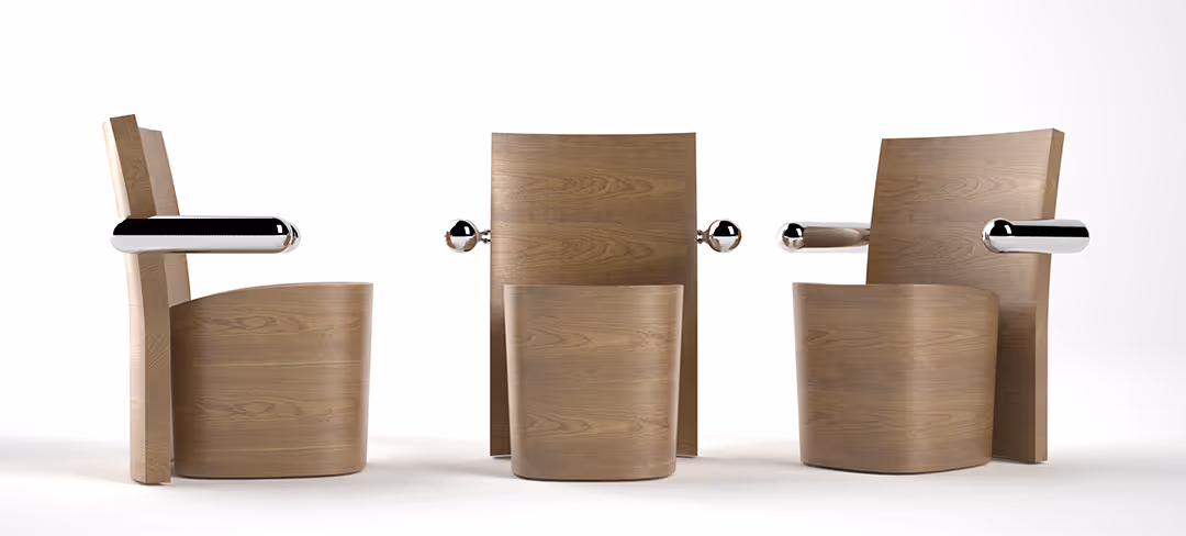 McGregor’s Brutalist Chair explores the intersection of mass and precision, restraint and power. Carved from solid walnut, the form is reduced to its purest architectural expression—planes of warm timber bending gently to cradle the body, their quiet curves offset by the assertive clarity of polished stainless-steel arms. These tubular elements punctuate the composition like exclamation points of reflection, their mirrored surfaces amplifying contrast and control. The piece embodies a studied tension between organic material and industrial finish, between craft and structure. What remains is an object of deliberate simplicity: brutal in honesty, yet serene in proportion—a sculptural meditation on permanence, tactility, and the discipline of minimal form.