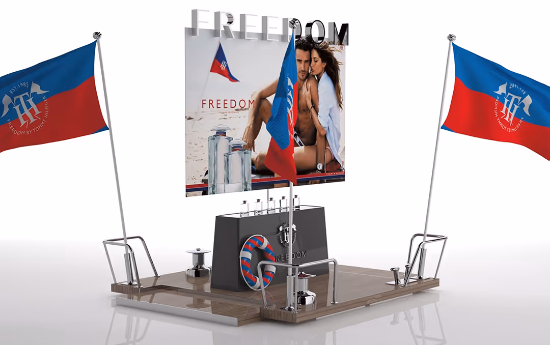 For the Freedom fragrance campaign, McGregor expanded the design language into a more nautical, yacht-inspired environment — a spatial embodiment of coastal luxury and open-air freedom. The installation evokes the polished geometry of a yacht deck: teak-toned flooring, chrome fittings, and maritime flags in Hilfiger’s signature red, white, and blue. Every element is distilled to precision and proportion — cushions echoing naval signal patterns, mirrored surfaces reflecting sea light, and a central fragrance display poised like the helm of a vessel. The space is both architecture and allegory, capturing the essence of American coastal sophistication through form, restraint, and atmosphere. Here, McGregor translates the Hilfiger ethos — optimism, adventure, and timeless style — into an environment that feels at once disciplined and liberating: a sculptural homage to the art of leisure and the pursuit of freedom itself.