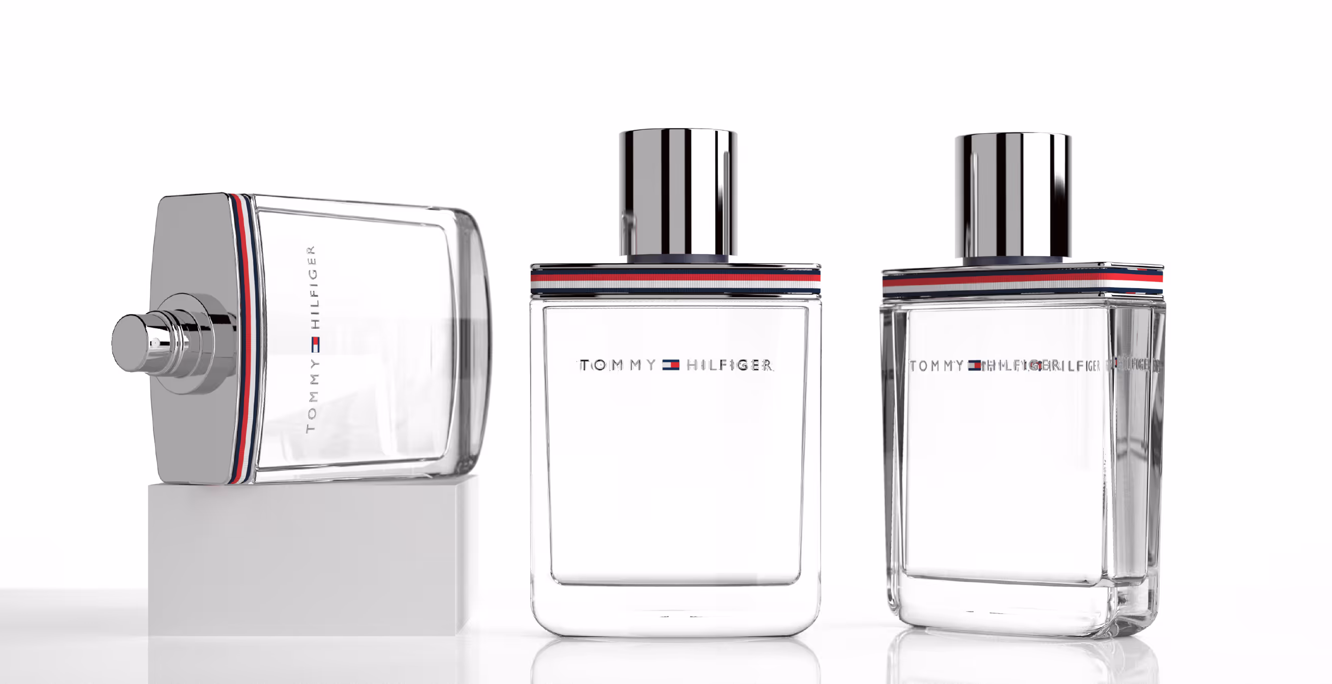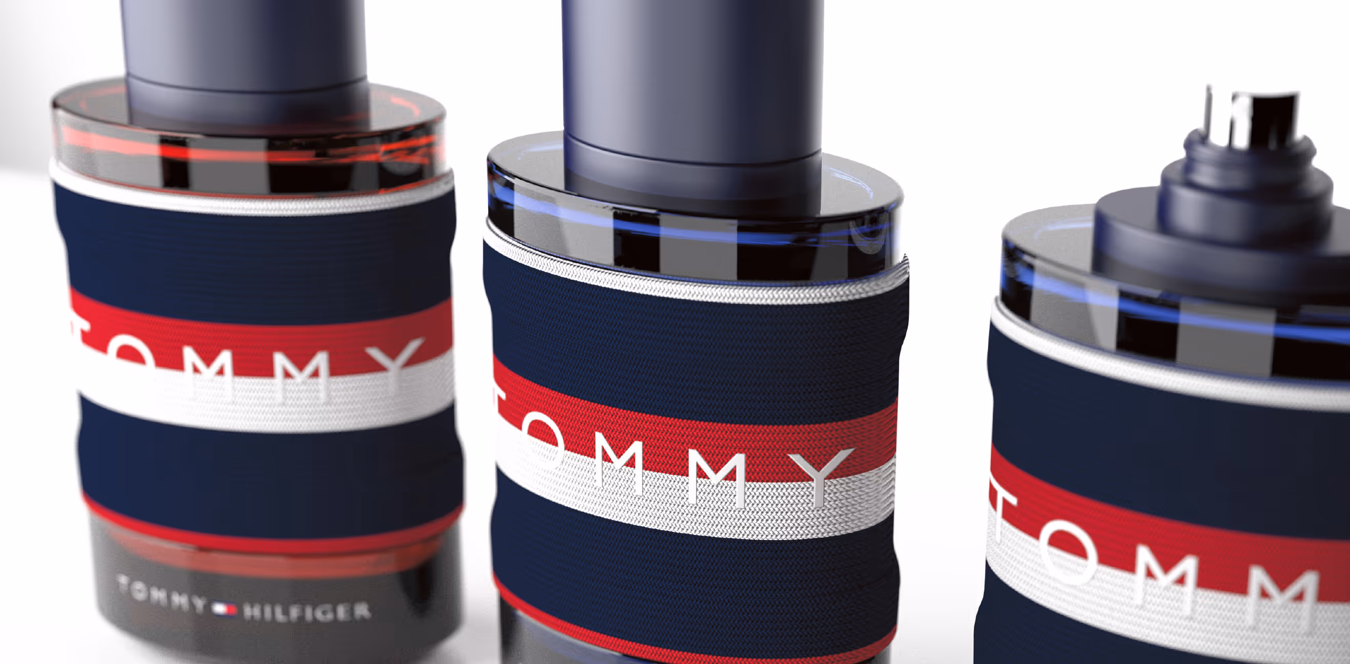 Expanding on the American Archetypes project, McGregor continued his exploration of national symbols reinterpreted through modern industrial design. These additional fragrance concepts draw from Tommy Hilfiger’s unmistakable visual DNA — the red, white, and blue flag transformed into architecture for scent. Each iteration refines the language of Americana: from the precision of ribbon-wrapped geometry to the tactile elasticity of woven textiles stretched over glass. The designs celebrate both craftsmanship and cultural code — where fashion iconography meets product design discipline. McGregor’s use of bold horizontals and crisp chromatic balance evokes varsity heritage, nautical heritage, and the optimism of 1990s youth culture, distilled into pure form. Whether through a fabric-clad sleeve or the subtle layering of flag motifs within transparent glass, these bottles embody the brand’s timeless duality — casual yet polished, classic yet forever new.