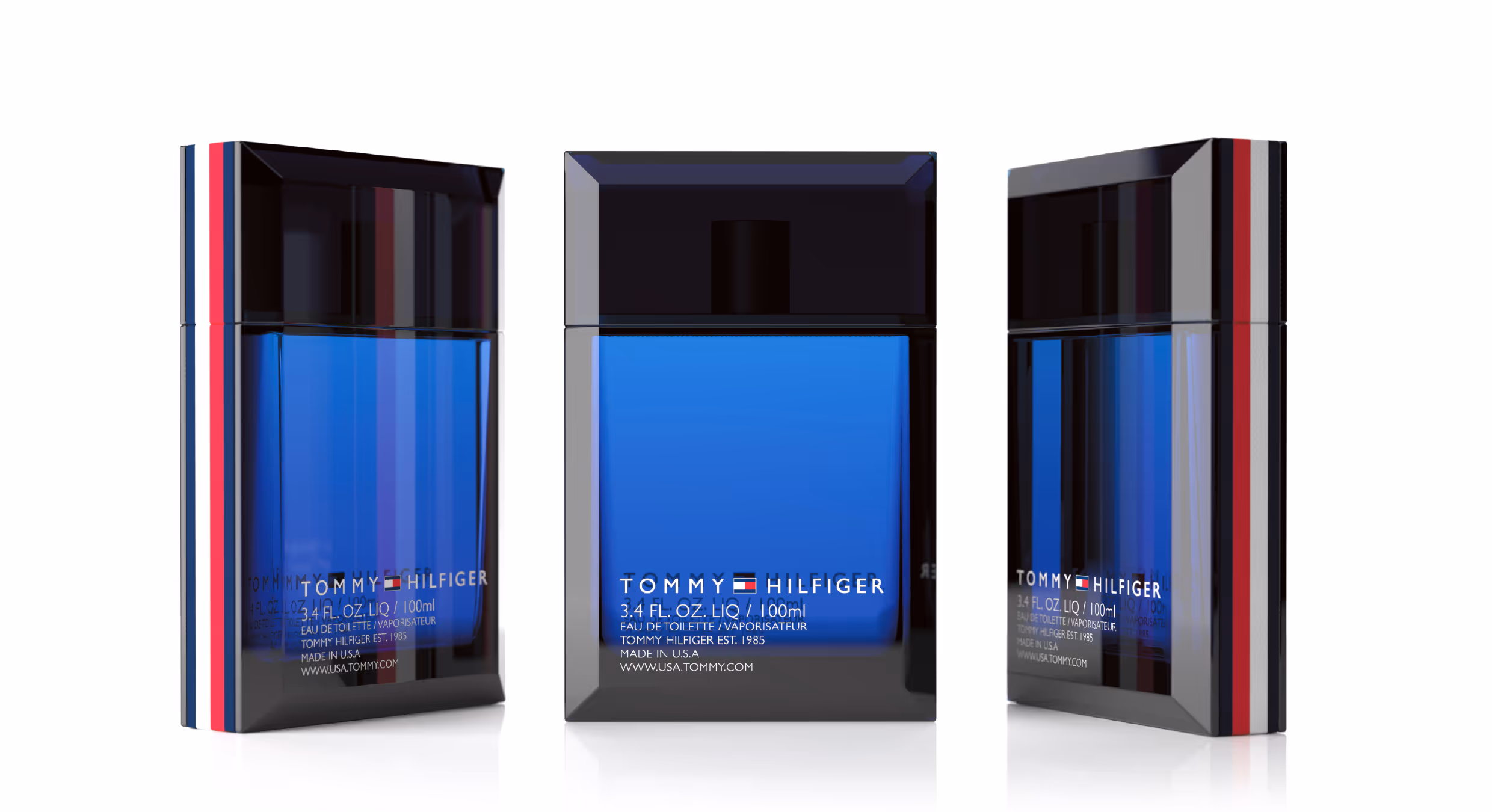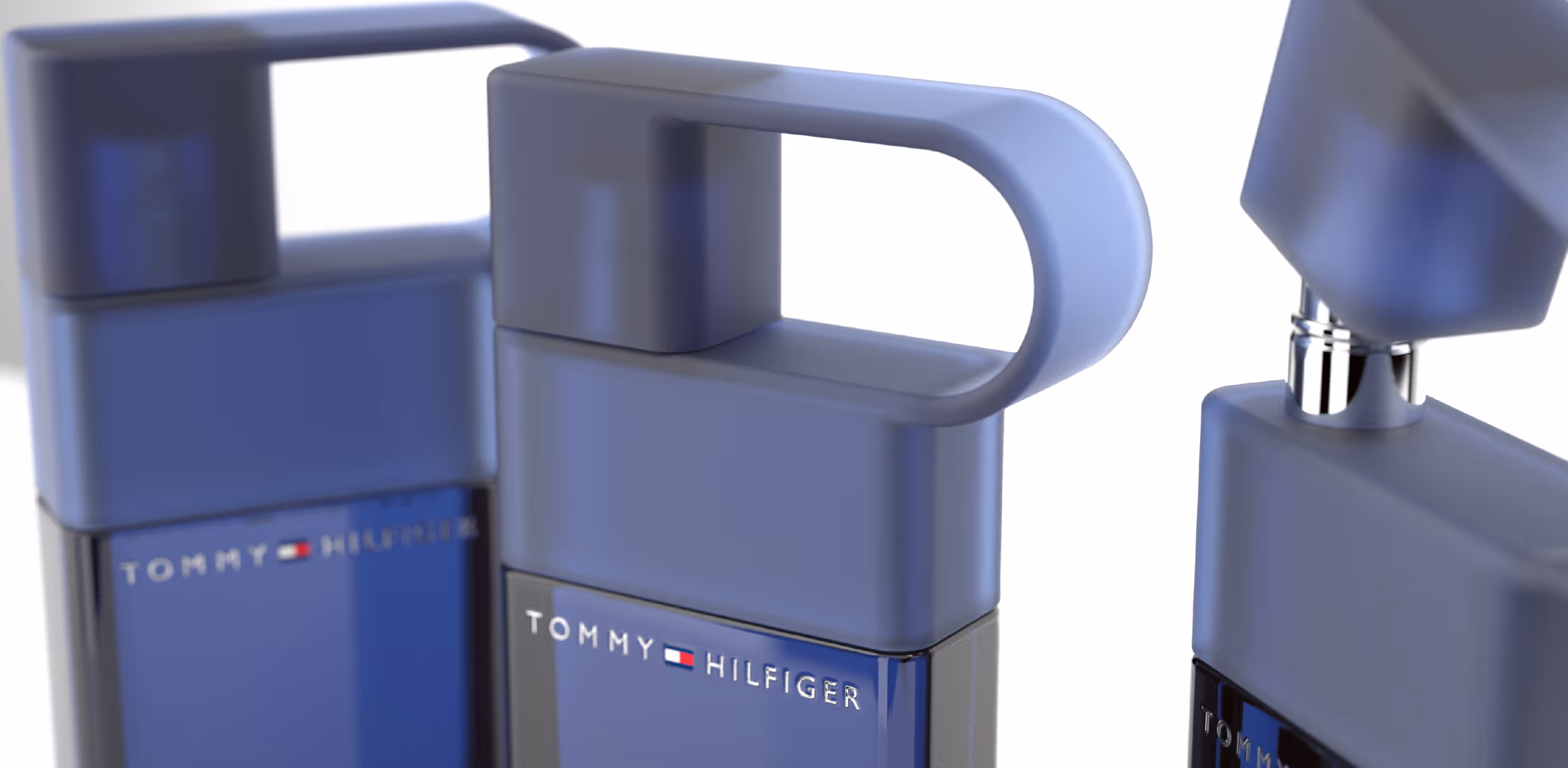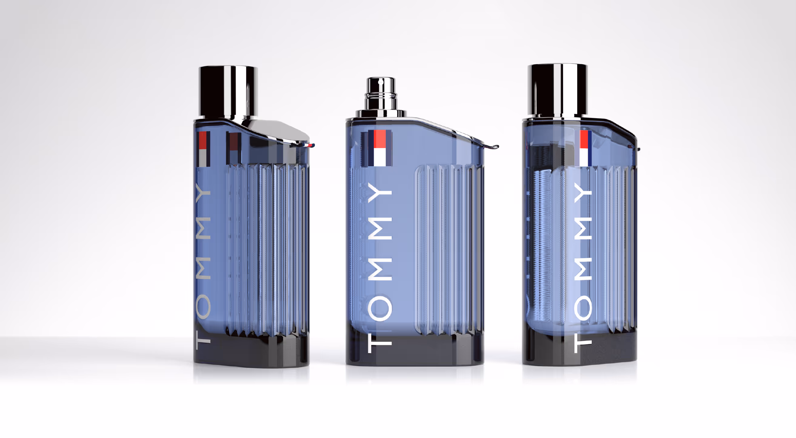 In this evolution of the American Archetypes collection, McGregor reinterprets the utilitarian icons of mid-century Americana through the refined lens of modern luxury. Drawing inspiration from vintage gas cans, varsity lettering, and mechanical precision, each design embodies a tactile narrative of function and pride. The first concept — with its matte rubberized flip-top cap and industrial hinge — channels the practicality of a portable fuel flask, reimagined in Hilfiger blue glass. The second introduces vertical ribbing, echoing the texture of classic automotive design, while maintaining a sleek architectural silhouette. The third, a monolithic “H” formed in heavy embossed glass, stands as both logo and structure — a sculptural emblem of identity. Finally, the striped, high-gloss variant translates the brand’s racing heritage into a minimalist study of color, proportion, and polish. Together, these explorations bridge craftsmanship and nostalgia — honoring American ingenuity while distilling it into pure, geometric modernism.